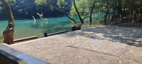 Al entrar podemos observar a lo lejos un bonito tono azul turquesa de agua que surge desde la parte inferior de una formación rocosa en forma de cueva, cabe mencionar que este paraje cuenta con diversa infraestructura, como estacionamiento, palapas, asadores, vestidores, baños y locales de comida.
